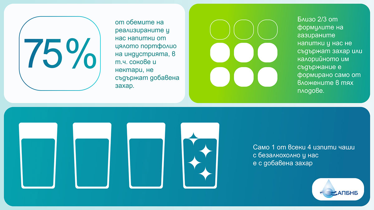 Само 1 от 4 изпити чаши с безалкохолно у нас е с добавена захар, чието количество устойчиво намалява. Това показват данните от годишното независимо експертно проучване за калоричността на реализираните на българския пазар безалкохолни напитки. 75% от обемите на реализираните у нас напитки от цялото портфолио на индустрията, в т.ч. сокове и нектари, не съдържат добавена захар.