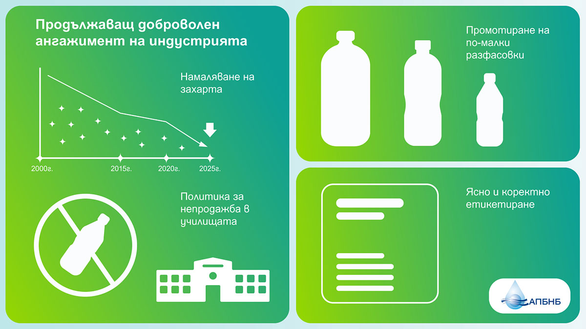 Индустрията за безалкохолни напитки и бутилирани води е първият сектор от българската хранително-вкусовата промишленост, ангажирал се доброволно и дори преизпълнил конкретната цел в призива на ЕС за доброволно намаляване на добавените захари с 10% до 20202. В нейното изпълнение секторът отчете намаляване с 15,21 % на внесената в хранителния режим захар от газираните напитки. Независимо експертно проучване за калоричността на реализираните на българския пазар безалкохолни напитки3 за периода 2015 – 2020 г. показа нарастване на дела на газираните напитки без захар (с 2,65 %), както и 6,7 % средно намаление на захарта на 100 ml в напитките от категорията, в чийто състав има добавена захар.