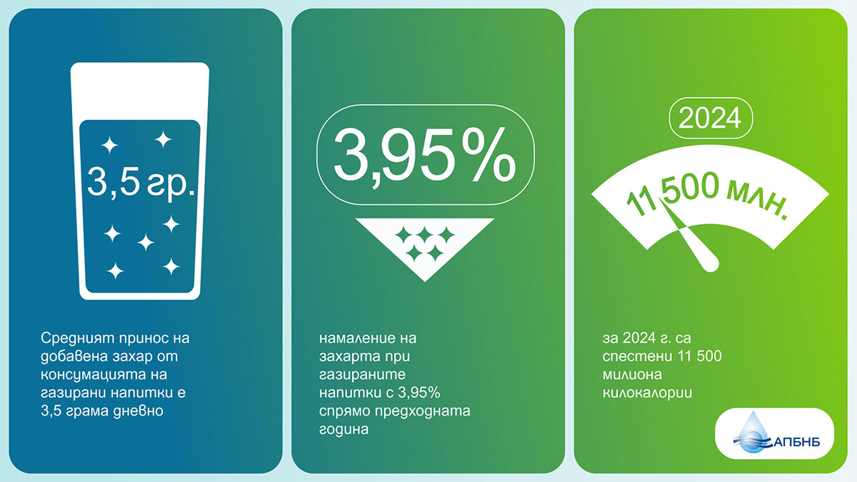 На база данните от НСИ за средното годишно потребление на член от домакинство през 2024 година, средният принос на добавена захар от консумацията на газирани напитки е 3,5 грама дневно. Това количество представлява едва около 7% от препоръчителния дневен прием на захари за възрастни, определен от СЗО. В резултат на вложените от индустрията усилия, при нивата на консумация за 2024 г. са спестени 11 500 милиона килокалории.